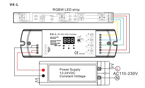 The LED controller V4-L / C4-L is a constant voltage or constant current RF receiver with numeric digital display, 4 channel output, which can be compatible with a variety of RF remotes to switch and dim RGBW, RGB, dual color or single color LEDs. Smooth dimming from 0.1% to 100% without any flickering can be very comfortable for human‘s eyes. Built-in 10 dynamic mode can create fancy lighting effects.