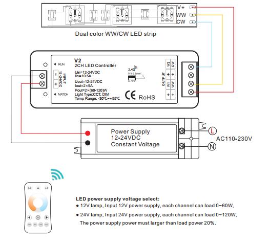 compatible with a variety of remotes to switch and dim dual color LEDs. The remote LED controller can
